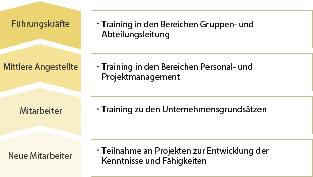 Neben dem Training praktischer Fähigkeiten planen und entwickeln wir ein vielseitiges Schulungsprogramm. Außerdem haben wir verschiedene Systeme eingerichtet, die es unseren Mitarbeitern ermöglichen, bei Bedarf entsprechende Kurse zu besuchen.