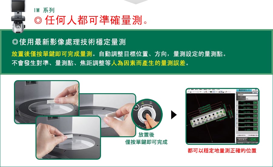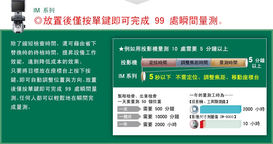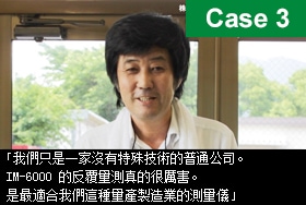 自從導入 IM-6000 後,尺寸檢查就變得輕鬆了。比較傳統在量測上所花費的時間,試產品或初次製作產品等,進行單品量測只需三分之一的時間,而且如果要連續量測已註冊的量產品,則可縮短至以往的百分之一。