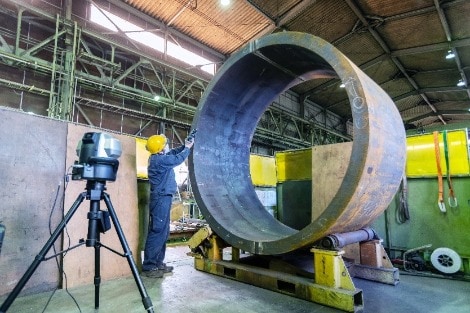 Dort wo herkömmliche Messmittel durch Bewegungseinschränkung oder ungenaue Messungen an ihre Grenzen stoßen, bietet das Mobile 3D-Koordinatenmessgerät die optimale Lösung. Es kann direkt in der Fertigung zum Einsatz kommen und auch ohne klimatisierten Messraum präzise Messungen an beispielsweise Flanschen vornehmen. Zusätzlich kann kabellos direkt ein Scan durchgeführt werden.