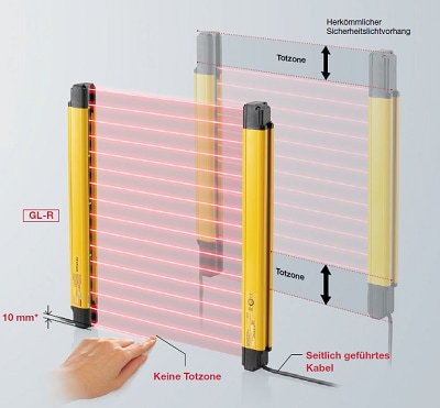 Dank der schmalen (9 mm breiten) und zurückgesetzten Frontabdeckung sind Lichtschranken der Modellreihe GL-R vor Stößen und Beschädigungen durch Werkstücke, Werkzeuge oder Bediener geschützt, ohne dass irgendwelche anderen Schutzvorrichtungen oder Abdeckungen erforderlich wären. Zudem ist die Modellreihe GL-R dank ihres Gehäuses mit Schutzart IP65/67 vor Wasser und Staub geschützt.