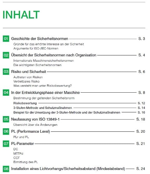 Dieser Leitfaden stellt eine Vielzahl von Sicherheitsinformationen vor, darunter Maschinensicherheitsnormen (für Produktionsanlagen und andere Maschinen), die Klassifizierung der Performance Level (PL), die zur Definition der Risikobewertung und der Sicherheitsfaktoren verwendet wird, sowie spezifische Sicherheitseinrichtungen und Sicherheitssysteme.