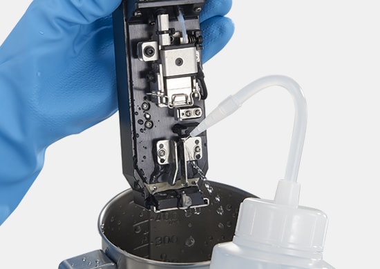 Zusätzlich zur Reinigung der Tintenzuführungen werden auch die wichtigsten Teile des Druckkopfs einer Hochdruckreinigung unterzogen. Dadurch entfällt die Notwendigkeit einer manuellen Reinigung.