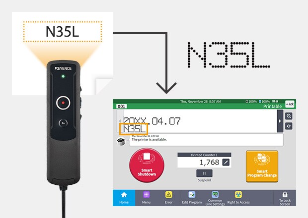 Der Druckinhalt kann ganz einfach geändert werden, indem ein Barcode oder eine Zeichenfolge auf einem Arbeitsauftrag oder an anderer Stelle gelesen wird. Da keine Eingabe über die Konsole erforderlich ist, können Fehler vollständig vermieden werden.