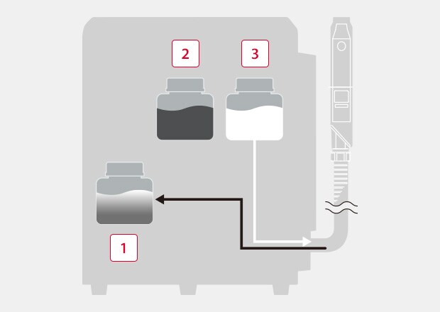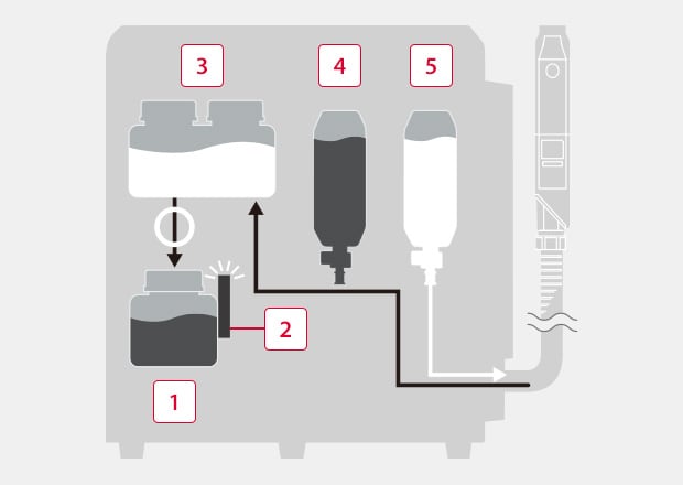 Der Aufbereitungstank wird zur temporären Speicherung verwendet, um eine Verdünnung der Tinte zu verhindern.
