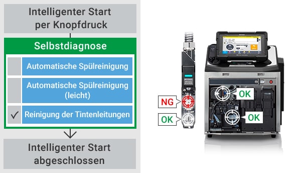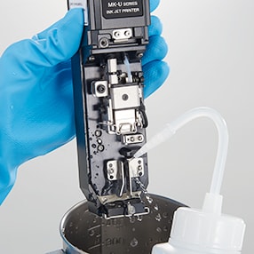 Die automatische Spülreinigungsfunktion der Modellreihe MK-G reinigt nicht nur die Tintenleitung, sondern auch alle Komponenten des Druckkopfes, die zur Aufrechterhaltung der Druckqualität erforderlich sind. Durch die Absaugung während der Reinigung werden auch weniger Gerüche ausgestoßen. Nach Abschluss der Reinigung trocknet das eingebaute Gebläse den Druckkopf automatisch.