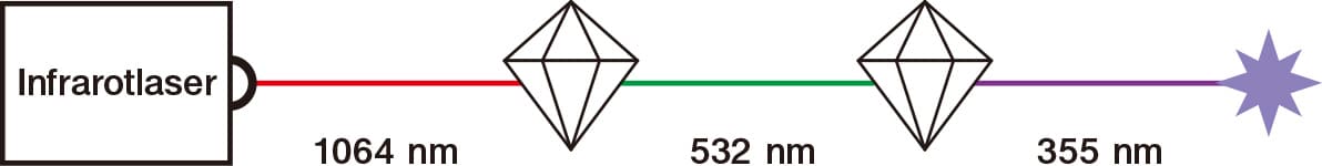 Zuerst wird ein 1064 nm Laser durch zwei Kristalle in einen 355 nm Laser umgewandelt. Der 355 nm Strahl zerstört nach Reduktion der Wellenlänge Bindungen direkt durch einen photolytischen Abbauprozess. Dieser Prozess wird als "Kaltmarkierung" bezeichnet, da er keine Oberflächenbereiche verbrennt und nur minimalen Wärmestress verursacht.
