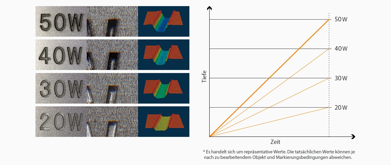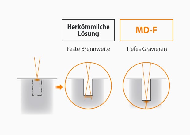 Die hohe Leistung von 50 W ermöglicht nicht nur schnelle Markierungen, sondern auch tiefe Gravuren. Die hohe Wärmeleistung dringt tief in die Materialien ein. Mit der Tiefengravur-Kontrolle des MD-F variiert die Brennweite bei jedem Laserdurchgang. Dadurch wird die maximale Energiedichte während der gesamten Markierung erreicht.