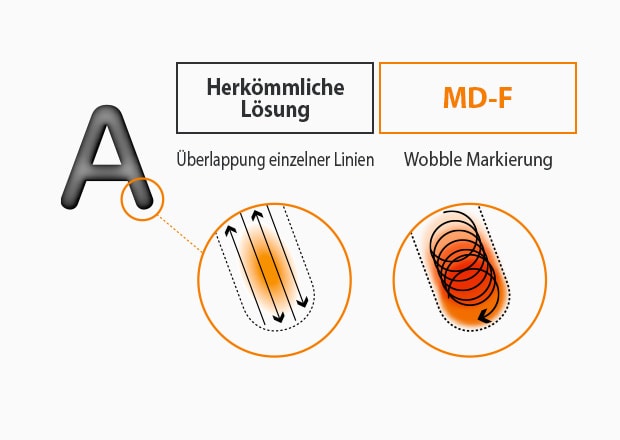Der MD-F Faserlaser erreicht hochwertige Anlassungen mit Wobble-Kontrolle. Die Wobble-Kontrolle lässt den Laser in einem kreisförmigen Muster statt in überlappenden Einzellinien bewegen. Das kreisförmige Muster sorgt für dicke Zeichen und konzentrierte Energie.
