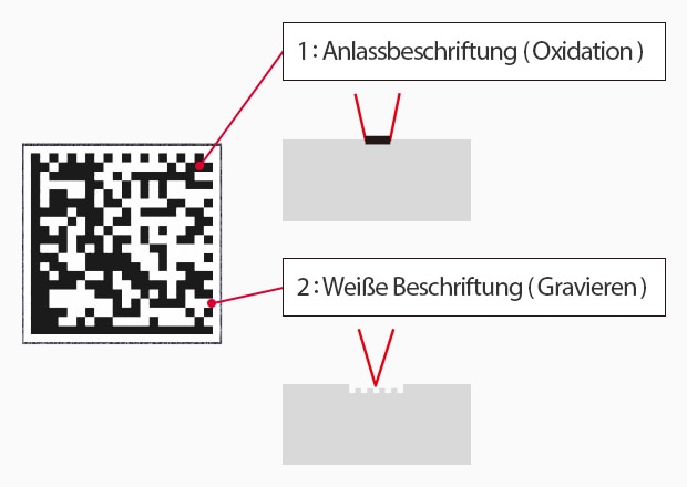 Der Kontrastunterschied zwischen schwarzen und weißen Zellen spielt bei der Beurteilung von 2D-Codes eine große Rolle. Ein Beschriftungslaser erzeugt unterschiedliche monochrome Farben, indem die Beschriftungsbedingungen zwischen weißer Beschriftung und Anlassbeschriftung verändert werden