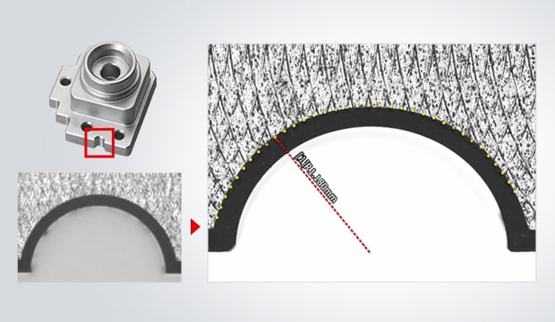 Der Messtaster mit geringer Antastkraft lässt sich vertikal, horizontal und in einem Winkel frei bewegen, sodass die gewünschten Punkte mit einer leichten Berührung gemessen werden können. Selbst Teile mit 3D-Formen lassen sich präzise und ohne Einspannen messen.