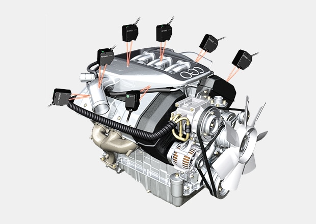 Zur Beurteilung von Motorleistung und -qualität ist die präzise Erfassung von Vibrationen entscheidend. Mit dem Mehrpunkt-Lasersystem von KEYENCE können Vibrationen an mehreren Stellen gleichzeitig gemessen werden – selbst kleinste Schwingungen werden zuverlässig erkannt.