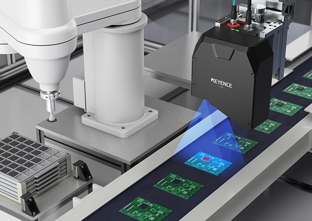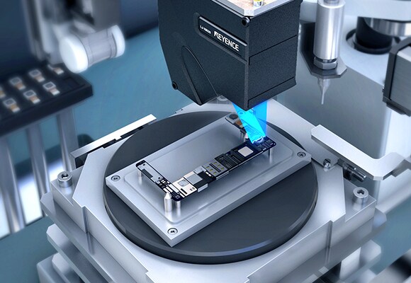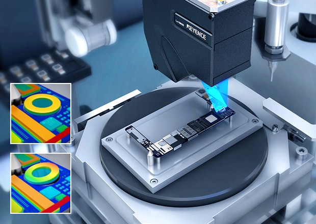 Der 3D Laser-Snapshot-Sensor der Modellreihe LJ-S8000 kann die Höhe und Neigung von montierten Leiterplattenkomponenten prüfen. Die Modellreihe LJ-S8000 ermöglicht eine 100%-Inline-Inspektion von Objekten, die bisher durch Sichtprüfungen oder Stichproben mit Messschiebern oder Mikrometern geprüft wurden. Bisherige Prüfverfahren können dank der 3D-Prüfung automatisiert werden.