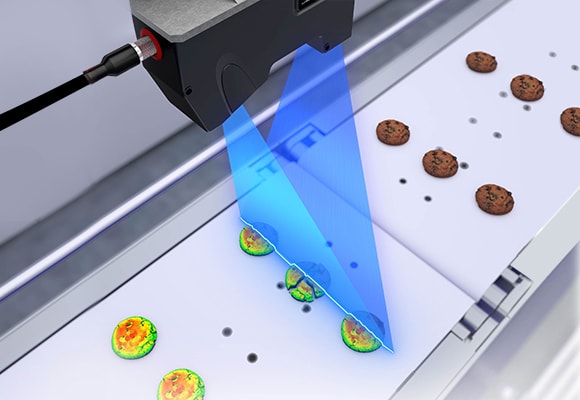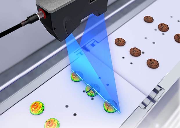 Das breite Sichtfeld des Laser-Profilsensors ermöglicht die Inspektion mehrerer Objekte, die gemeinsam auf einem Förderband transportiert werden. Die 3D-Positionskorrektur kann verwendet werden, um jeden Keks im Messbereich zu identifizieren und zu inspizieren, wodurch eine genaue Sortierung zur Verbesserung der Qualität und zur Vermeidung von Abfall ermöglicht wird.
