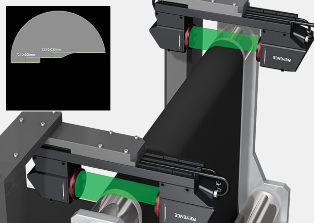 Die Modellreihe TM-X5000 erfasst die 2D-Kontur der Materialkante, um eine hochpräzise Dickenmessung zu ermöglichen. Durch die Erfassung des umliegenden Bereichs kann die Modellreihe TM-X5000 eventuell auftretende Bahnverschiebungen oder Unwuchten der Walzen erfassen und so die Materialdicke unabhängig von der Oberflächenbeschaffenheit präzise bestimmen.