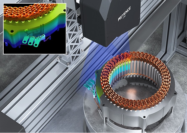Der 3D Laser-Snapshot-Sensor der Modellreihe LJ-S8000 verwendet einen Linienlaser, um die Zieloberfläche abzutasten. Dabei werden gleichzeitig Höhe und Position der Anschlüsse von Statoren geprüft. Durch den integrierten Scan-Mechanismus der Modellreihe LJ-S8000 entfallen zusätzliche Komponenten wie Achsen oder Encoder – ebenso wie der Aufwand für deren Auswahl und Integration. Eine Inspektion ist einfach durch Integration des Sensors in die Anlage möglich.
