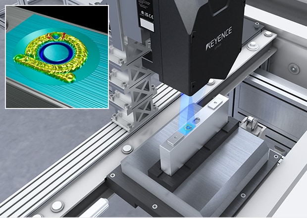 Die Messung der Höhe von Stromschienen vor dem Schweißen sowie die Inspektion der XY-Positionen nach dem Schweißen können mit einem einzigen System durchgeführt werden. Obwohl die Inspektion der X- und Y-Positionen mit herkömmlichen Bildverarbeitungssystemen möglich ist, können mit den 3D-Daten der Modellreihe LJ-X8000 sowohl XY-Positionen als auch Z-Höhendaten gleichzeitig geprüft werden.