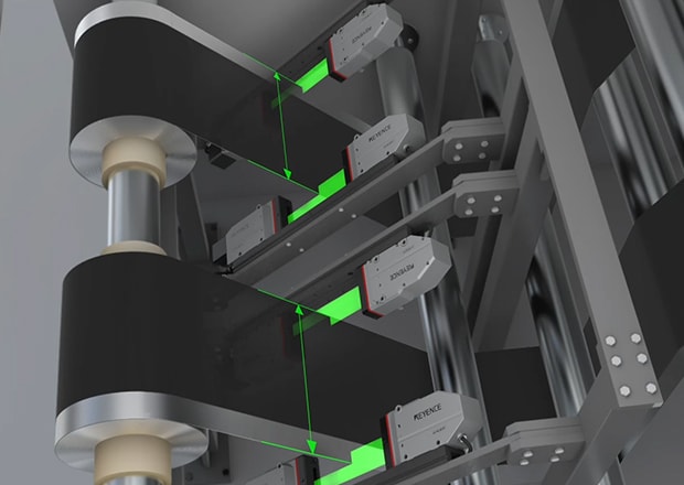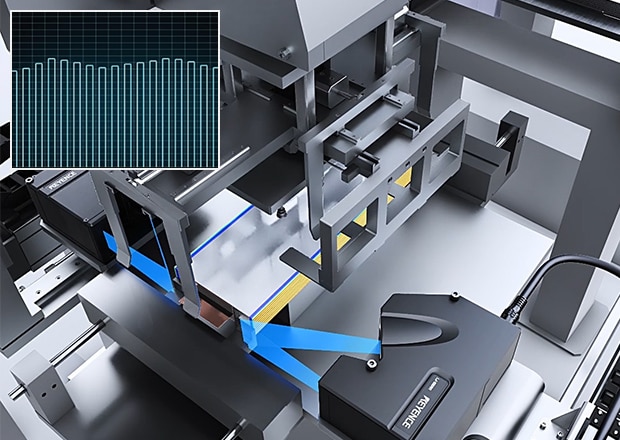 Das Vorhandensein einer Fehlausrichtung wird nach dem Laminierungsprozess überprüft. Die Modellreihe LJ-X8000 kann Profile mit einem minimalen Pitch von 2,5 µm erfassen, wodurch sichergestellt wird, dass jedes Elektrodenprofil auch während des Transports präzise gemessen wird.
