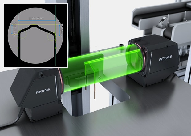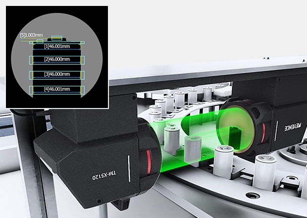 Der Außendurchmesser wird gleichzeitig an mehreren Positionen gemessen, nachdem der Deckel auf die Dose aufgepresst und befestigt wurde. Die Hochgeschwindigkeitsberfassung und eine große Tiefenschärfe von bis zu ±20 mm ermöglichen eine stabile Inline-Inspektion.