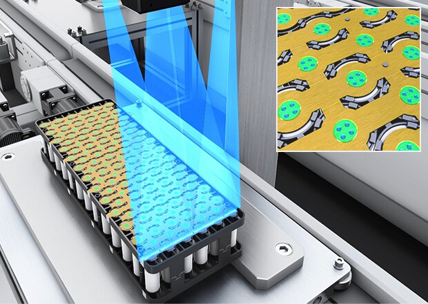 Die Breite der Elektrodenfolie, die zuvor von Schneidmaschinen getrennt wurde, wird mittels Inline-Messung bestimmt. Die Abmessungen können ohne Einfluss von Umgebungslicht oder einer Neigung der Elektrode während des Transports verwaltet werden.