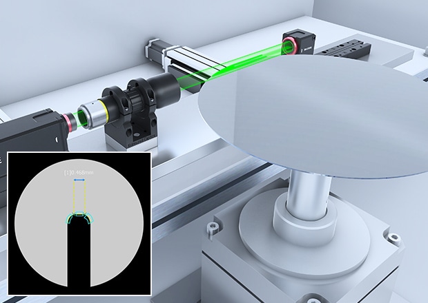 Die Kantenform des Wafers wird berührungslos gemessen. Die Modellreihe TM-X5000 mit doppelt telezentrischer Optik erfasst das Profil mit hoher Auflösung und ermöglicht so eine präzise Messung.