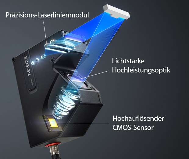 Der CMOS-Sensor erfasst die Laserlinie mit 3200 Pixeln pro Profil. Darüber hinaus ermöglicht der hohe Dynamikumfang des Sensors, dass auch extreme Reflektivitätsunterschiede jederzeit stabil erfasst werden.