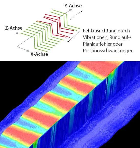 Bei der Aufnahme eines 3D Bildes aus einzelnen 2D Profilen kann es aufgrund von Vibrationen, Rundlauffehler oder Positionsschwankungen zu Abweichungen in der Darstellung kommen. Die neue Korrekturfunktion für die Profilausrichtung beseitigt Abweichungen des 2D-Profils in X-, Z- und θ-Richtung. Dies erlaubt eine korrekte Aufnahme von 3D Daten auch unter schwierigen Bedingungen.