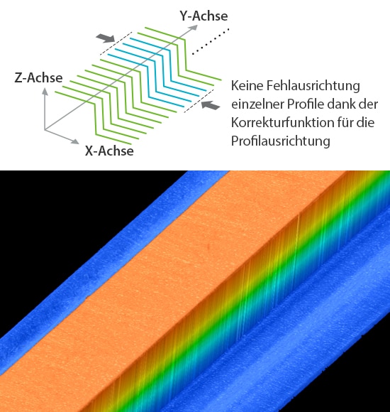Die Profilausrichtung ermöglicht das Erstellen eines optimalen 3D-Bildes. Dies sorgt für stabile Inline-Prüfungen auf Vertiefungen, Späne und andere Defekte.