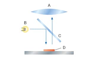A: Objektiv, B: Lichtquelle, C: Halbspiegel, D: Messobjekt