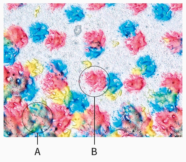 A: Lebendige Farbdarstellung der Tinte  B: Detaillreiche Darstellung der Oberflächentextur