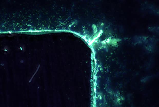 In der Luftfahrt- und Automobilindustrie werden fluoreszierende Eindringmittel verwendet, um mikroskopisch kleine Kratzer und Risse zu erkennen, die mit dem bloßen Auge nicht sichtbar sind. Die fluoreszierende Farbe wird auf das Messobjekt aufgetragen und dann abgewaschen, so dass nur die fluoreszierende Substanz in den Kratzern und Rissen zurückbleibt. Wird diese Substanz mit UV-Licht bestrahlt, erzeugt sie eine Fluoreszenz, die mit dem bloßen Auge und mit Kameras überprüft werden kann. Mit der Modellreihe VHX lassen sich mikroskopisch kleine Kratzer bei hoher Vergrößerung abbilden, wobei die Visualisierung durch UV-Licht essenziell ist.