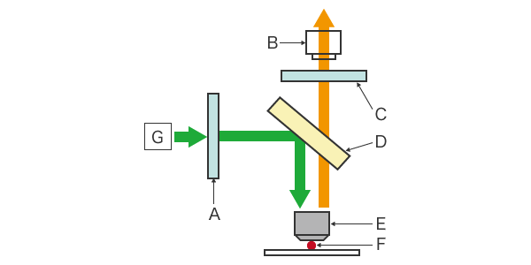 Der Strahlteiler trennt das Anregungslicht von der Fluoreszenz. Im Gegensatz zu gewöhnlichen Spiegeln reflektiert dieser Spiegel nur Licht mit bestimmten Wellenlängen und filtert alles andere Licht heraus. Da das Anregungslicht von der Probe reflektiert wird, wird nur die von der Probe emittierte Fluoreszenz zur CCD-Kamera übertragen.