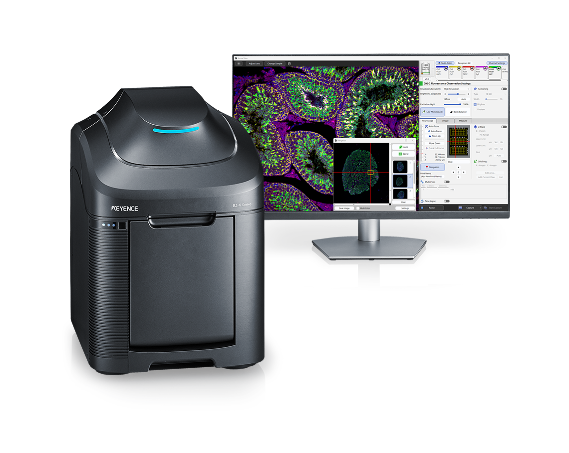 Trotz der kompakten Größe verfügt die Modellreihe BZ-X über einen großen motorisierten Objekttisch, der mit Mikrotiterplatten zur effizienten Betrachtung mehrerer Proben verwendet werden kann. Es können bis zu sechs Objektive montiert werden und die CCD-Kamera kann zwischen Farb- und Schwarz-/Weiß-Modus umschalten. Die meisten Einstellungen können am PC durchgeführt werden, vom Wechsel der Objektive und Filter bis hin zur Fokuseinstellung. Der Low-Photobleach-Modus und eine schnelle Autofokus-Funktion ermöglichen auch Neulingen, scharfe Aufnahmen zu erfassen.