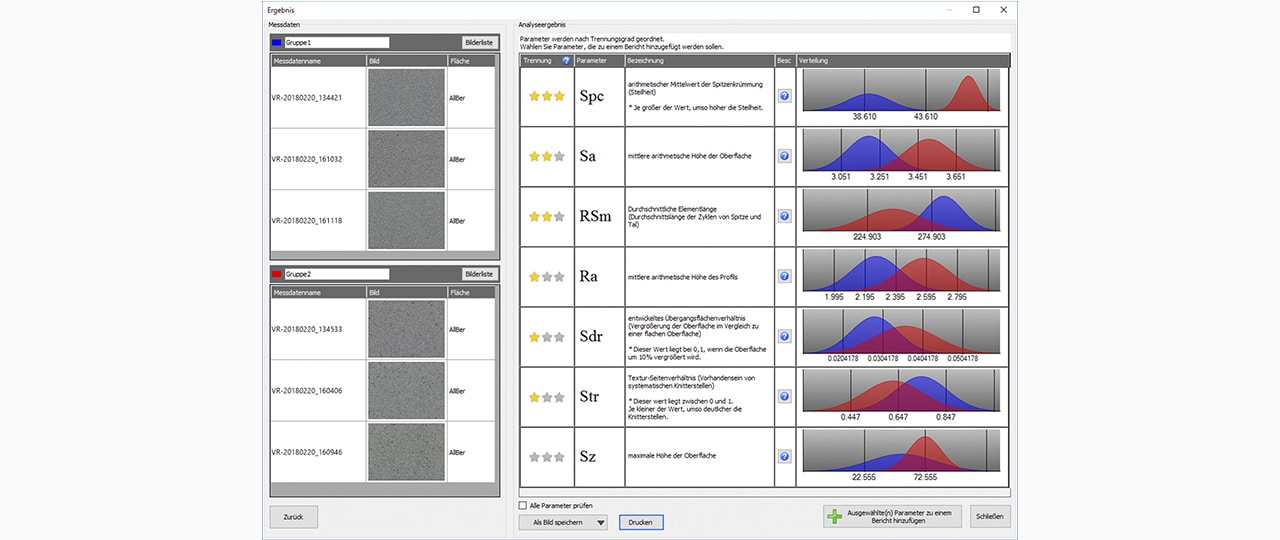 Verschiedene Rauheitsparameter werden verglichen, um den signifikantesten Unterschied sofort zu bestimmen.