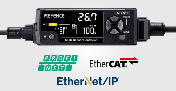 Durch die Verwendung der Modellreihe MU-N mit der KEYENCE-Modellreihe NU können Daten über Standard-Industrienetzwerke übertragen werden.