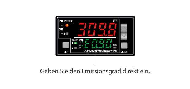Unterschiedliche Materialien weisen unterschiedliche Emissionsgrade auf. Die für die Messung notwendige Einstellung des passenden Emissionsgrades erfolgt spielend einfach in nur zwei Schritten.