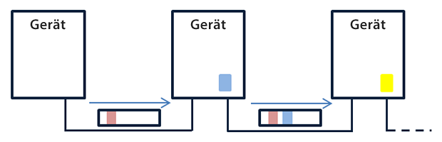 Das vom EtherCAT® Teilnehmer gesendete Telegramm durchläuft alle Teilnehmer. Die einzelnen Teilnehmer lesen die zugewiesenen Ausgangsdaten "on the fly" und schreiben die Eingangsdaten gleichzeitig in den dafür vorgesehenen Frame. Vom letzten Teilnehmer aus wird das Telegramm wieder zum Master gesendet.