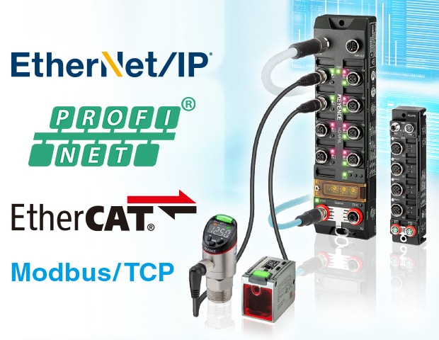Durch die Unterstützung typischer industrieller Netzwerke wie EtherNet/IP®, Modbus/TCP, PROFINET und EtherCAT® können IO-Link Master problemlos mit Feldnetzwerken und Maschinensteuerungen verbunden werden.