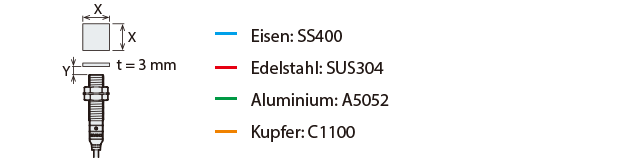 Der Erkennungsabstand variiert je nach Material, Größe und Stärke des zu erkennenden Objekts. Der Erkennungsabstand kann anhand eines zu erkennenden Objekts überprüft werden, indem der Erkennungsabstand Y (mm) im Kennliniendiagramm „Änderung des Erkennungsabstands je nach Größe und Material des zu erkennenden Objekts (Standardbeispiel)“ mit dem Koeffizienten im folgenden Kennliniendiagramm multipliziert wird.