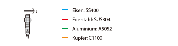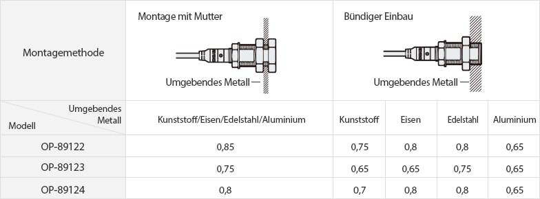 Der Erkennungsabstand verringert sich bei Verwendung der Schnellwechselhalterung. Der Erkennungsabstand ändert sich auch bei bündiger Montage je nach Material des umgebenden Metalls. Die folgenden Faktoren, multipliziert mit dem Erkennungsabstand aus den technischen Daten, dienen als Richtwert.
