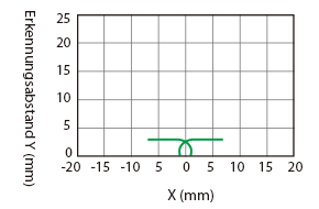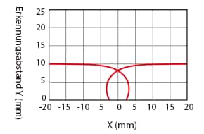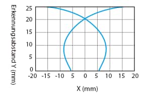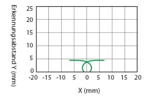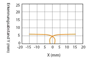 Im Diagramm werden entsprechend der Position und Bewegung eines Standardobjekts (gemäß den Spezifikationen) in Pfeilrichtung parallel zum Sensor die Einschaltpunkte des Ausgangs dargestellt (Ausgangssignal wechselt auf EIN).
