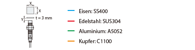 Der Erkennungsabstand variiert je nach Material, Größe und Stärke des zu erkennenden Objekts. Der Erkennungsabstand kann anhand eines zu erkennenden Objekts überprüft werden, indem der Erkennungsabstand Y (mm) im Kennliniendiagramm „Änderung des Erkennungsabstands je nach Größe und Material des zu erkennenden Objekts (Standardbeispiel)“ mit dem Koeffizienten im folgenden Kennliniendiagramm multipliziert wird.