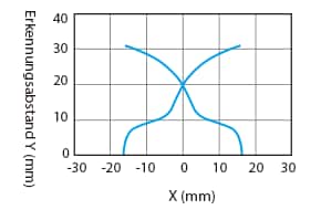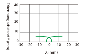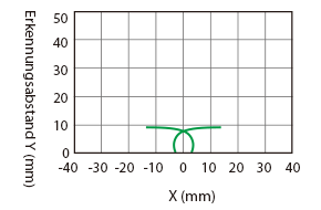 Im Diagramm werden entsprechend der Position und Bewegung eines Standardobjekts (gemäß den Spezifikationen) in Pfeilrichtung parallel zum Sensor die Einschaltpunkte des Ausgangs dargestellt (Ausgangssignal wechselt auf EIN).