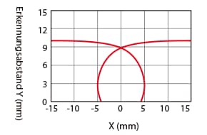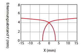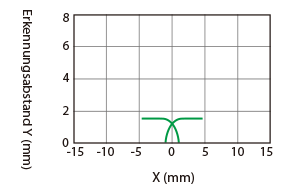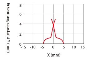 Im Diagramm werden entsprechend der Position und Bewegung eines Standardobjekts (gemäß den Spezifikationen) in Pfeilrichtung parallel zum Sensor die Einschaltpunkte des Ausgangs dargestellt (Ausgangssignal wechselt auf EIN).