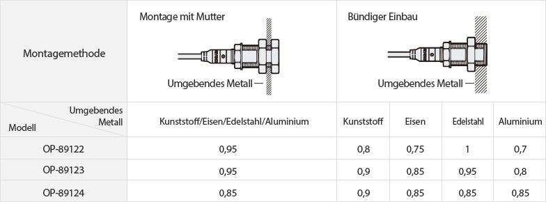 Der Erkennungsabstand verringert sich bei Verwendung der Schnellwechselhalterung. Der Erkennungsabstand ändert sich auch bei bündiger Montage je nach Material des umgebenden Metalls. Die folgenden Faktoren, multipliziert mit dem Erkennungsabstand aus den technischen Daten, dienen als Richtwert.