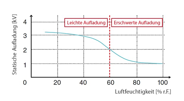 Es besteht ein offensichtlicher, enger Zusammenhang, zwischen Feuchtigkeit und statischer Elektrizität. Die genaue Bestimmung dieses Zusammenhangs ist jedoch schwierig. Mit einem Elektrostatischen Sensor kann dieser Zusammenhang jedoch genau bestimmt werden, da dieser Feuchtigkeit und statische Elektrizität gleichzeitig messen kann.