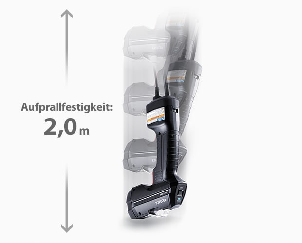 Das Gehäuse der Pistole besteht aus sehr robustem Polycarbonat-Kunststoff, ist beständig gegen Beschädigungen durch externe Stöße und weist eine Aufprallfestigkeit aus 2,0 m Höhe auf. Die hohe Lebensdauer und die äußerst widerstandsfähige Bauweise stellen sicher, dass das Gerät auch bei häufiger Benutzung sicher eingesetzt werden kann.