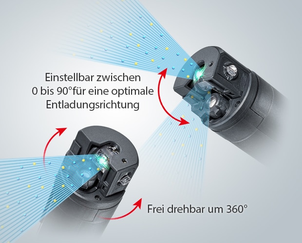 Das kompakte Gehäuse und die Düse sind jeweils um einen Freiheitsgrad drehbar, um so die Entladungsrichtung individuell anpassen zu können. Selbst bei engen Platzverhältnissen können Sie so den Ionenstrom optimal auf die Objekte ausrichten.