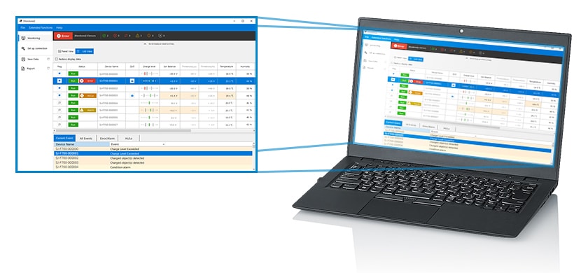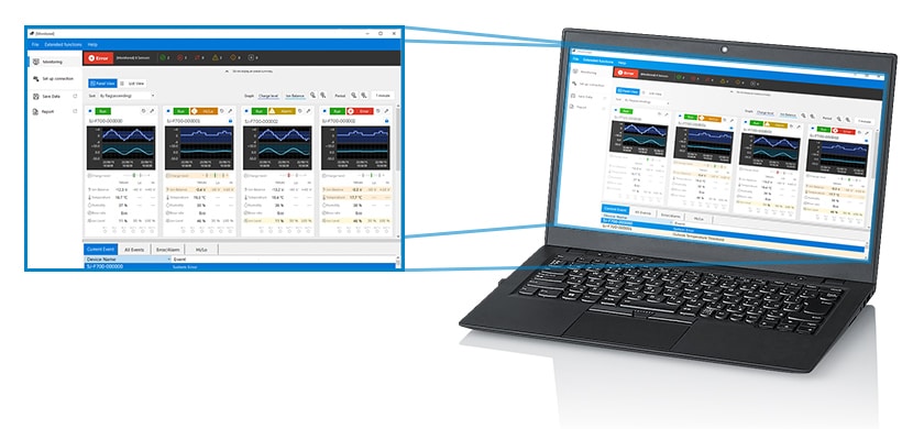 Ermitteln Sie den Status von bis zu 100 Geräten mit nur einem PC, ohne vor Ort sein zu müssen. Die Einstellungen können zudem nach Bedarf geändert und in einer Excel-Datei ausgegeben werden.