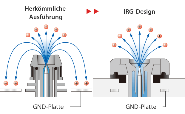 Mit Hilfe der automatischen Ionenregelung der Ionisierer werden elektrostatische Ladungen unabhängig von der Polarität schnell und zuverlässig neutralisiert. Durch das IRG-Design mit innen liegender Erdungsplatte können die Entladungsstäbe mit oder ohne Druckluft betrieben werden. Eine schnelle Entladung kann so auch bei unterschiedlichen Anforderungen gewährleistet werden.