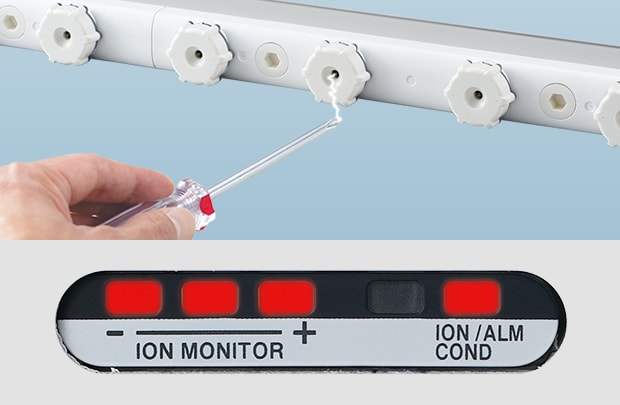 Die Entladungsstäbe der Modellreihe SJ-HA haben eine integrierte Selbstdiagnosefunktion, welche kontinuierlich die erzeugte Ionenmenge überwacht. Mit der Balken-LED und den Alarmfunktionen zeigt Ihnen der Ionisator an, wann eine Wartung erforderlich ist.